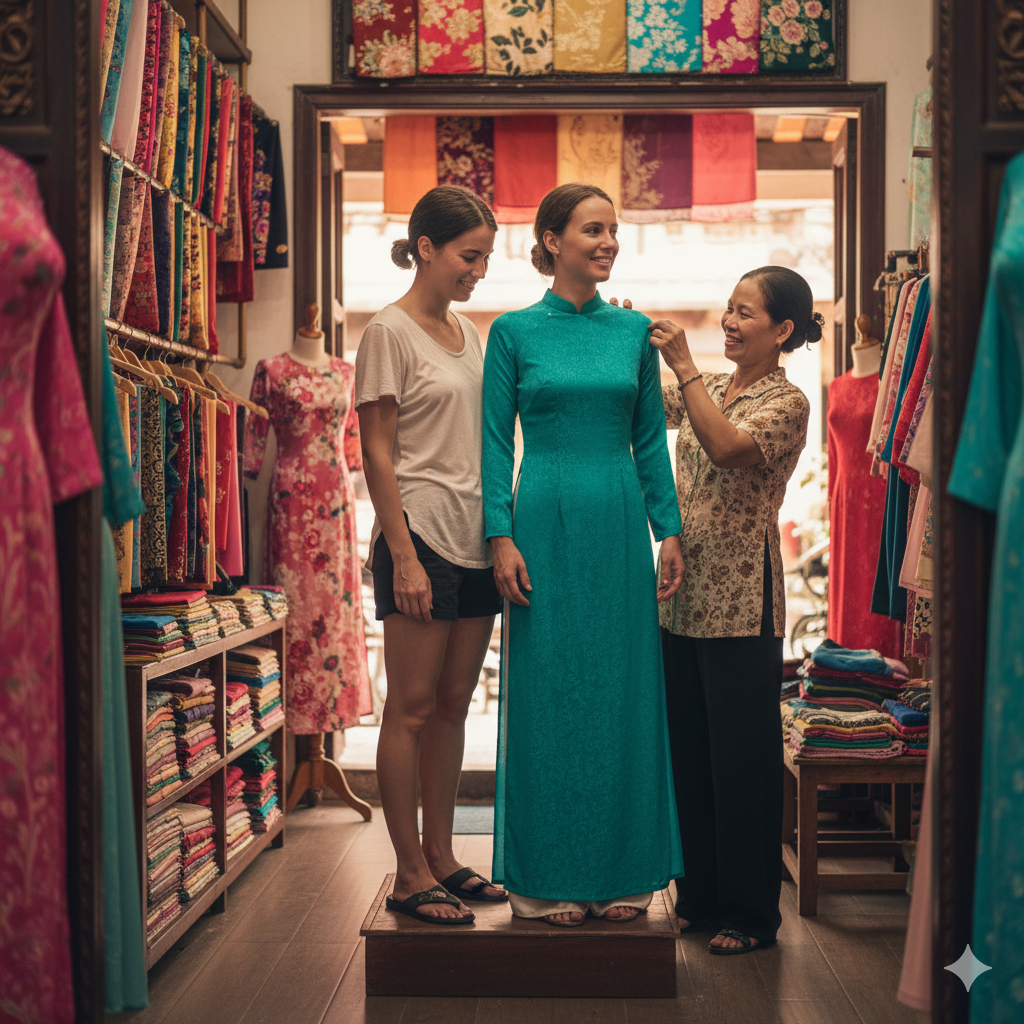 기성품을 사고 싶다면 시장이나 쇼핑몰에 가보세요. 하지만 아오자이는 몸에 딱 맞아야 예쁘기 때문에, 가능하면 맞춤을 추천해요.